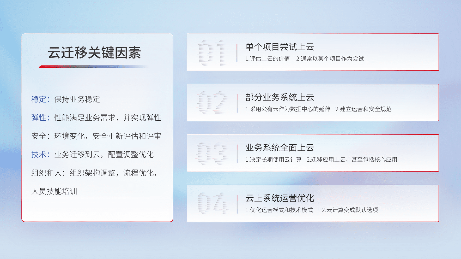 结合实际业务,,从规划设计、、、云平台选型、、、、云原生改造、、、数据迁移、、集成交付,,迁移全过程为客户识别最佳上云路径,,做好风险识别管理,,,设计网络架构、、、身份权限、、安全审计合规、、、操作审计、、、日志审计、、、监控告警策略、、、、多站点容灾设计等,,对云上基础设施进行整体规划,,,,提升IT治理水平,,,以满足弹性、、高可用、、高性能的需求。。。。