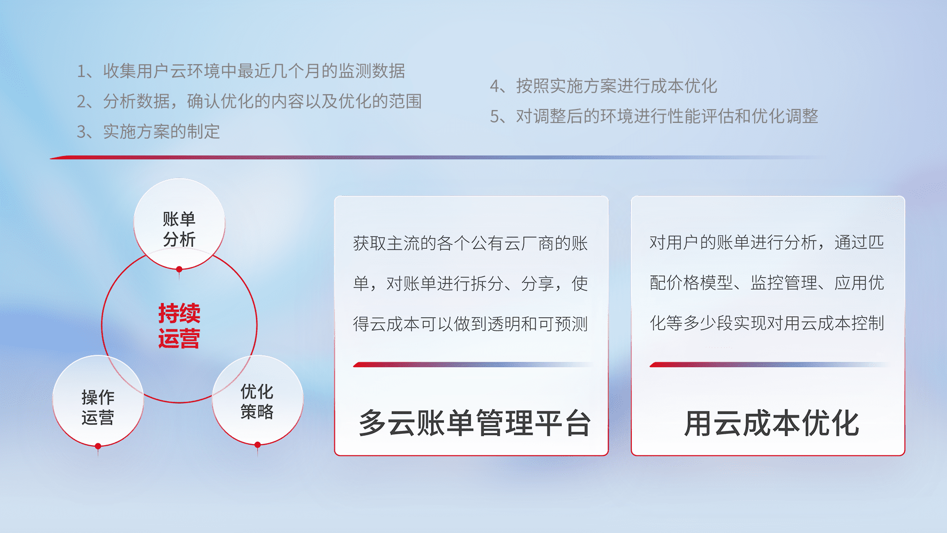通过多云纳管,,,,以统一的资源数据模型把客户的云资源进行抽象和封装,,,进而实现对多云资源的统一操作,,,,保障云资源管理的可靠性、、稳定性与可用性。。。。量身定制化运维内容,,,配置、、、开发运维、、补丁管理、、、、备份、、、监控、、、、认证和访问管理、、、、审计和日常巡检等,,,保障在用云过程中的可靠度,,,,稳定度以及高可用率。。。。