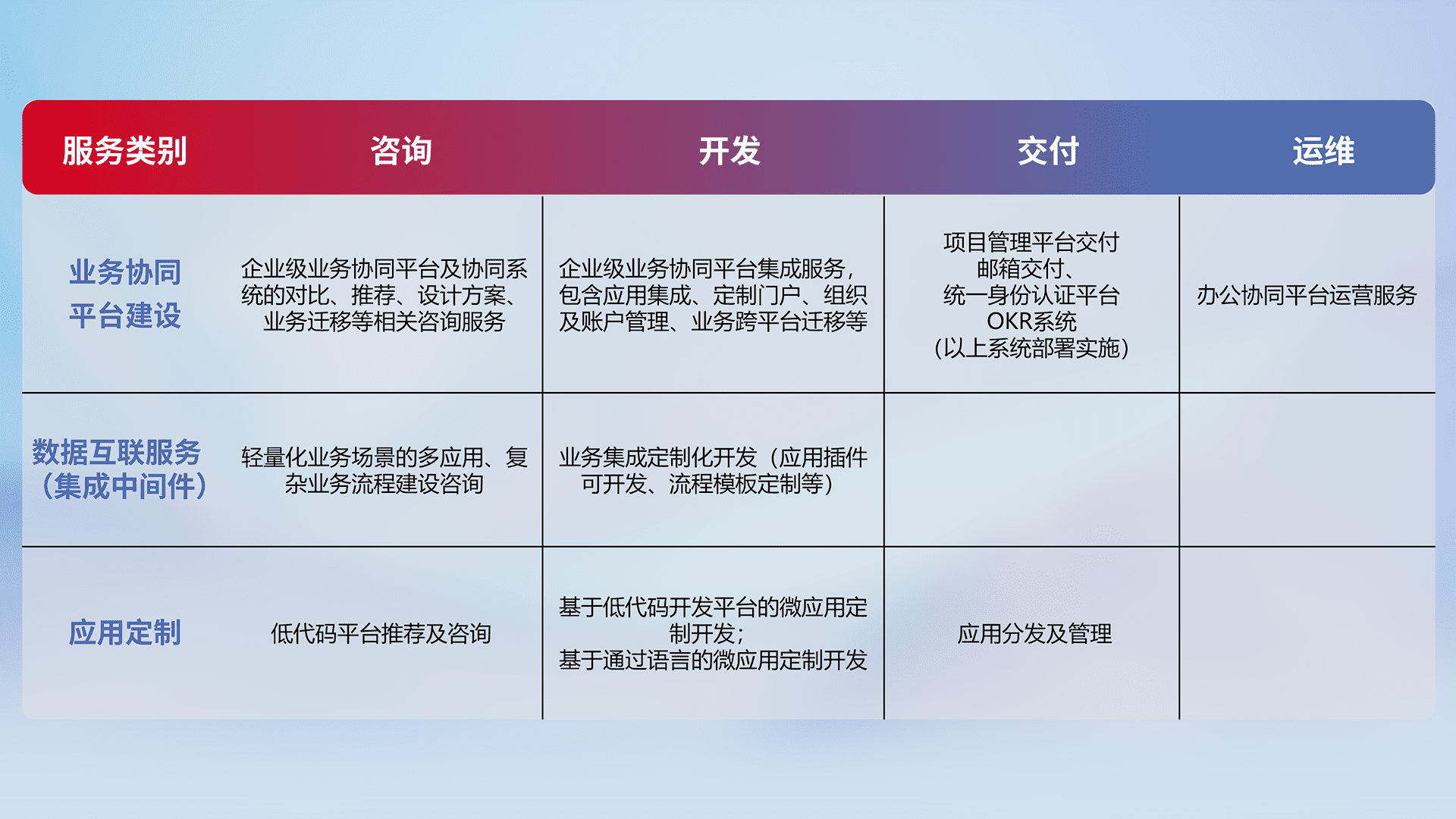 针对钉钉、、、、企微、、、IDaas等平台级产品提供产品的规划、、、、方案、、、交付、、、、定制化开发等服务,,实现如统一协同办公、、智能客户服务、、混合会议管理、、、智能数据查询、、等业务场景,,,实现数字化转型。。